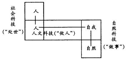 (2)自然科技界有人宣扬“惟一科技”论,否认人文科学和社会科学。如“科学仅指自然科学”,自然“科学是惟一正确的至高无上的知识体系”,自然“科学不许胡说,人文允许(甚至鼓励)胡说”;“科学人文,水火不容,如果硬要二者牵手,则会既毁了科学,又毁了人文”[9]。国内外“综合的科学主义”(应该称为“唯自然科学主义”)认为:自然“科学独自能够并逐步解决人类面临的所有的,或者是几乎所有的真正难题”。自然“科学技术是导向人类幸福的惟一有效的工具”,“一切社会问题都可以通过(自然)技术的发展而得到解决”[10]。这是一种典型的“惟自然科技”论。其实,研究自然界的自然科技如同人文科技(研究人和人类自身)、社会科技(研究人与人之间关系)一样,作为客观形态的知识体系都是脱离主体而外在于物质载体上(以人脑为载体的知识属于主观形态),都是“死”的东西,怎么能撇开人的活动而“独自”解决真正的难题呢?就拿人同自然的对话来说,人向自然做出某种行动并在自然界产生某些后果,于是人又要作出另一个行动予以回答……所以认识和改造世界(即“解决真正的难题”),实质上是人的自我问答的动态过程,而人是生活于人与人的关系之中。因此,人所从事的现实活动,都是自然科技(“做事”)、人文科技(“做人”)和社会科技(“处世”)融汇于一身并产生集成效应[11](见图3)。