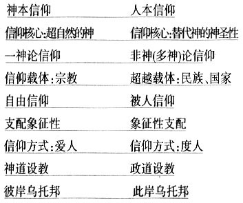 马克斯·韦伯讲的权力三种形式,传统的、人格的、法理的,与保罗·蒂里希讲的三种国家象征,魔鬼的、神圣的、世俗的,正好相互吻合。其中,法理的权力与世俗的国家相互配合,是怀疑论政治的核心;而传统的、人格的权力与神圣的、魔鬼的国家彼此配合,是信仰论政治的核心。以神替代人,或以人替代神,神人关系之间经常呈现的是一种双向利用;代神立言,以己为神,或用自己的意志解释神的意志,用神学的方法来进行权力的合法性证明等等,这两大信仰类型与两大权力模式,在历史上均有很强大的表现和历史悲剧结果。但信仰论政治与怀疑论政治并非完全对立,它们之间有冲突,也有整合,甚至还有相互之间的转移;至于它们之间的彼此较量,人类历史上一直都很激烈,迄今未有最后的结局。如同神圣与世俗永远辩证而对立,神圣通过世俗成为与世俗对立的另一物那样,成为另一对立面之物,反而能制造价值差异,让人意识到它之所以为“神圣”。这个神圣由此成为了宗教人、信仰者的活力泉源,进而会久居在这“神圣”的中心。虽然有神本、人本信仰两大类型,但其结果大多是以个己为中心的信仰立场,来面对其他不同信仰。这就使信仰冲突成为人类处境的一项基本特征,不仅局限于信仰、宗教或政治领域,而且始终内在于现代人的政治生活之中。
